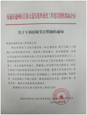 5月24日晚九點(diǎn),隨著江海大道東延一標(biāo)圩亭河橋右幅3#橋臺(tái)澆筑結(jié)束,標(biāo)志著我公司承建的江海大道東延一標(biāo)下部結(jié)構(gòu)(樁基礎(chǔ)含樁底壓漿、承臺(tái)及墩身)的施工在全線(xiàn)七個(gè)標(biāo)段中率先完成,比合同約定完成的節(jié)點(diǎn)時(shí)間提前了22天。受到工程建設(shè)指揮部的表彰和節(jié)點(diǎn)獎(jiǎng)勵(lì)。